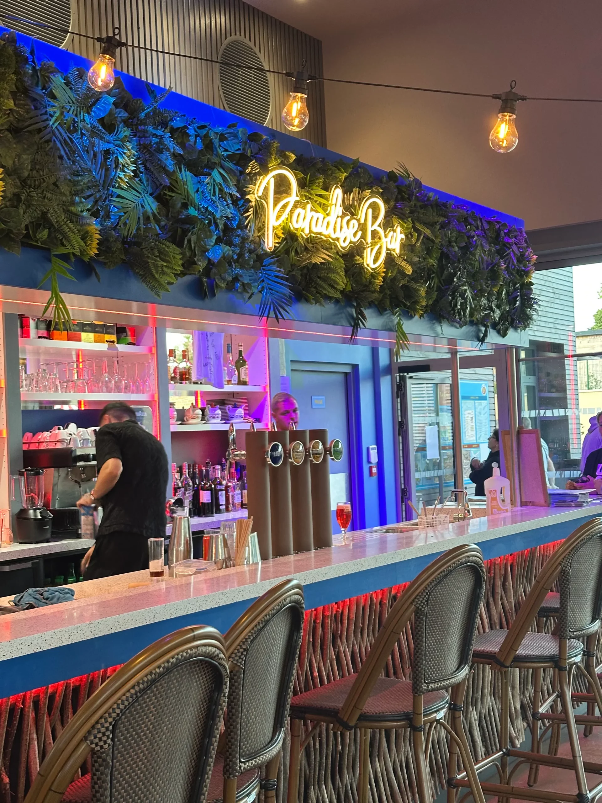 Bar lumineux avec décor tropical et personnes.