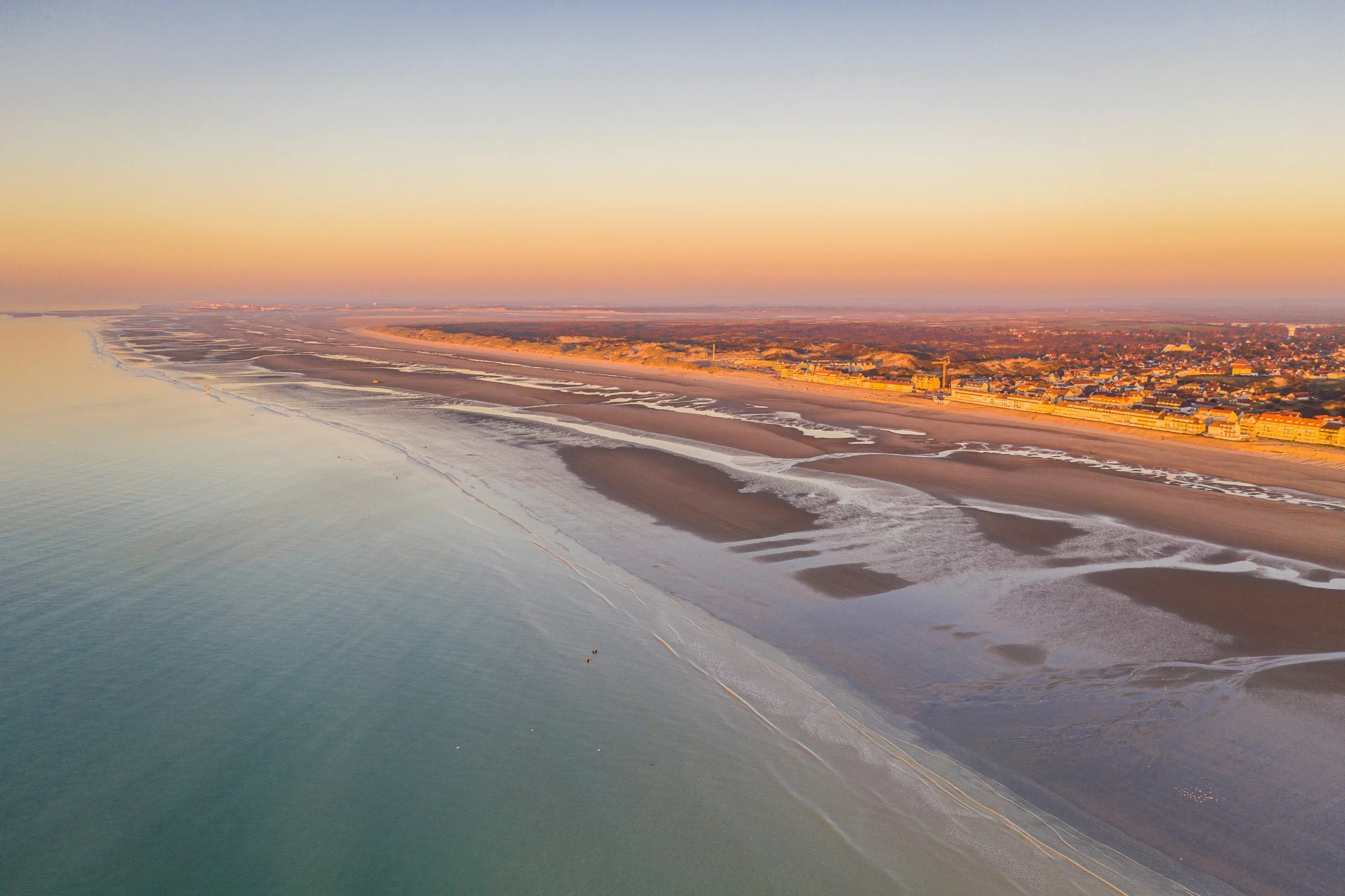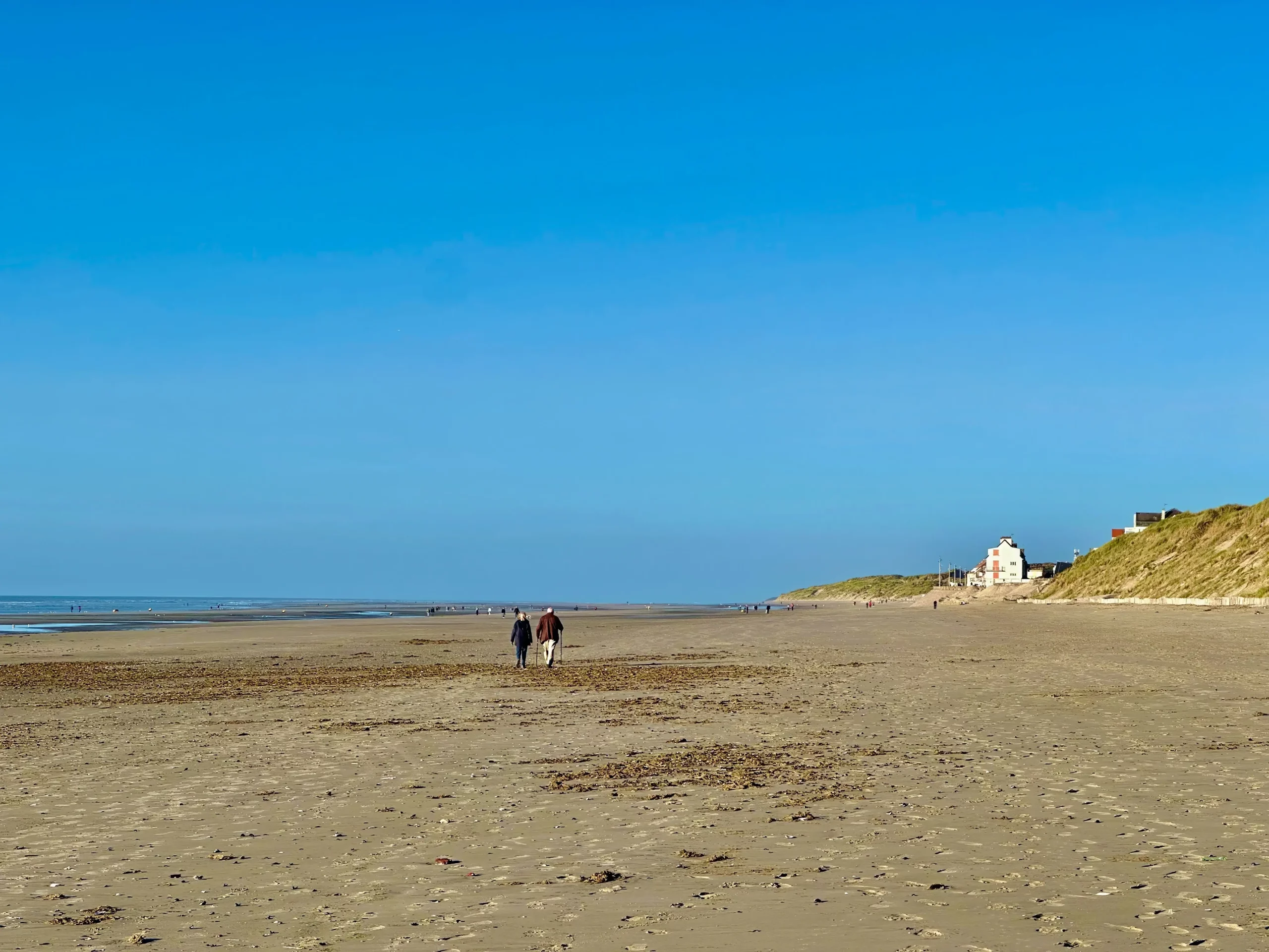 Promeneurs sur une plage sous ciel bleu clair.