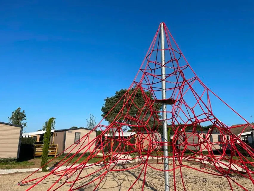 Structure d'escalade en corde rouge dans une aire.