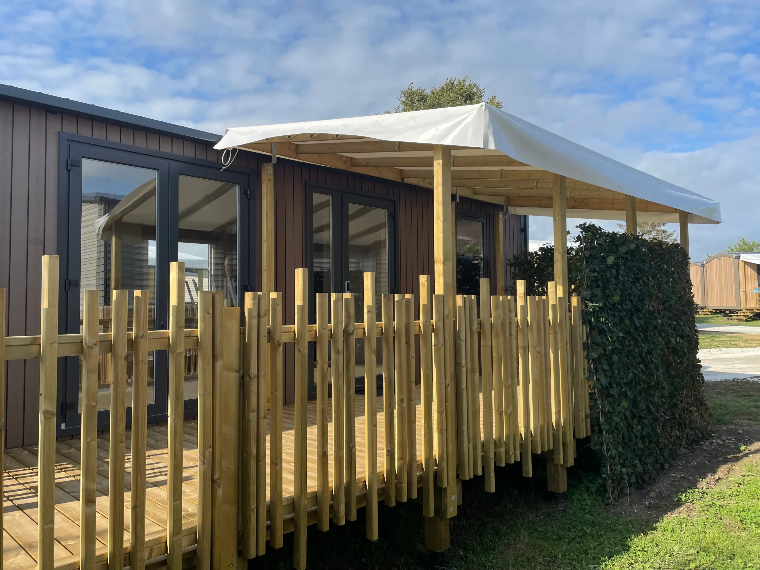 Mobil-homes ensoleillés dans un camping verdoyant.