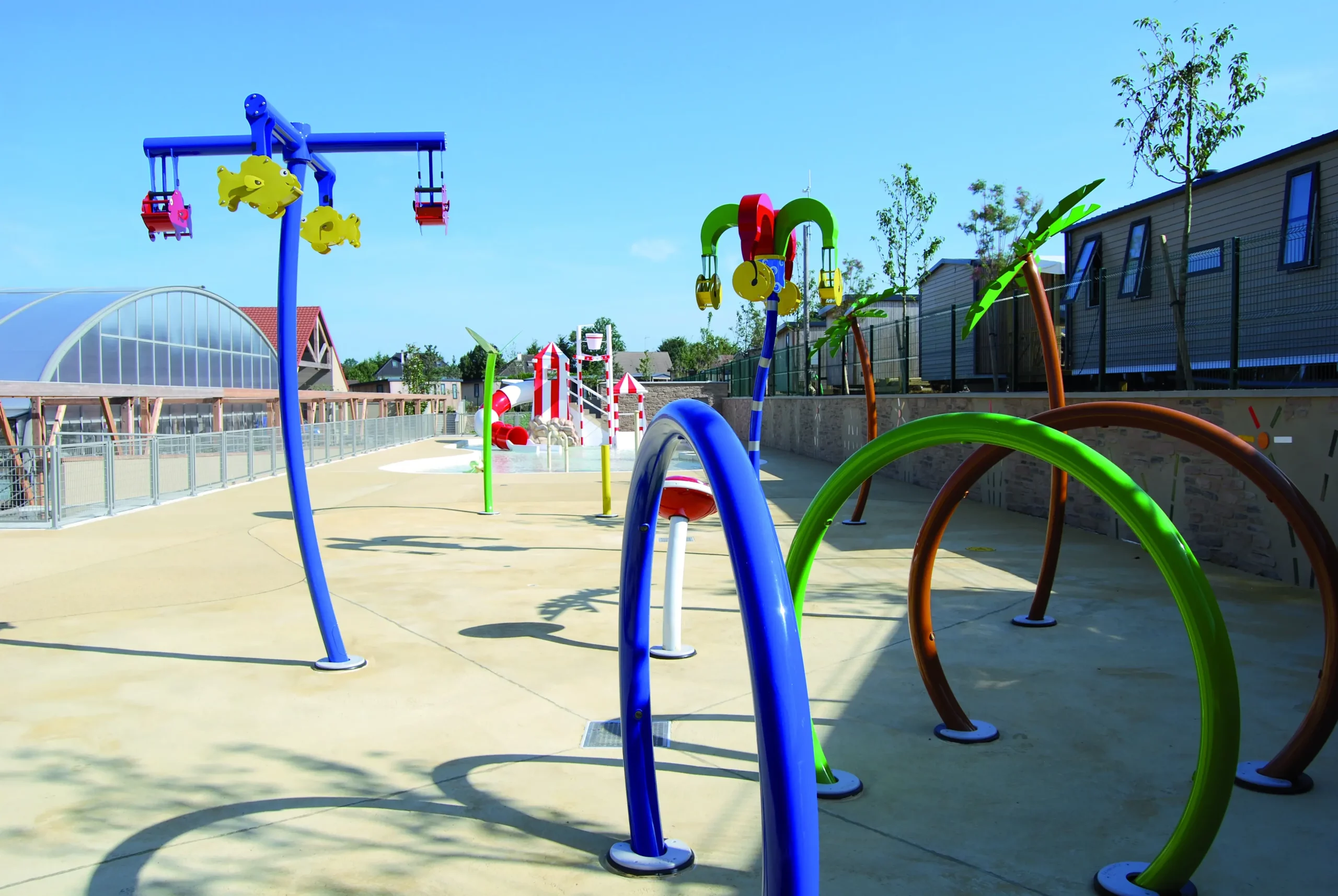 Zone de jeux aquatiques colorée et moderne extérieure.