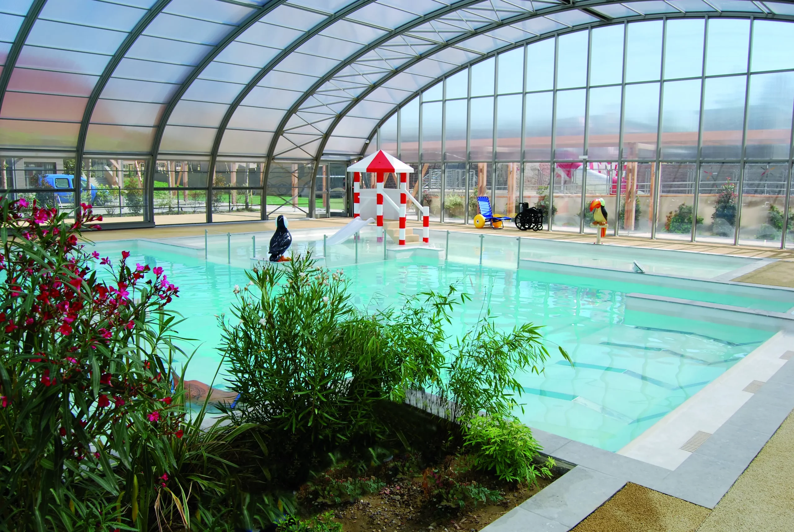 Piscine intérieure avec jardin et toboggan.